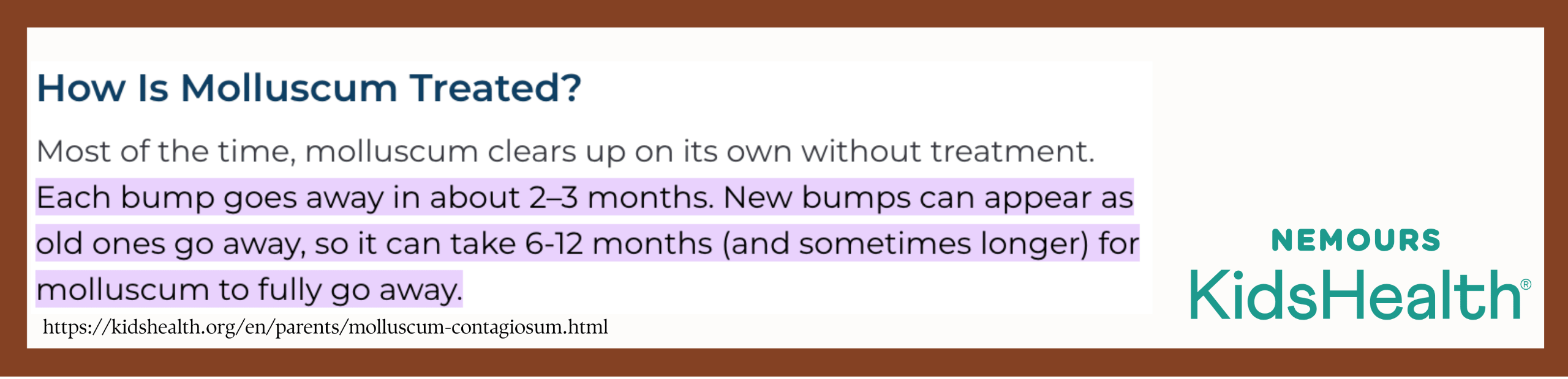 Many pediatric sources explain that molluscum is common, contagious, and typically takes 6–18 months to resolve on its own.